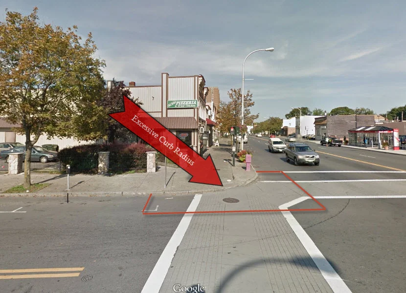The picture to the right shows the street corner where the boy and his mom were standing waiting to cross. Note the curve of the curb where the arrow is pointing. This is called the curb radius. The larger the radius, the more gradual the curve and the easier it is for a vehicle to take the corner without slowing down. In a paradigm where traffic flow is the primary concern and the safety of drivers is the secondary concern (with the safety of those outside a vehicle being a far distant concern by comparison), the standard industry practice is to have as large of a radius as possible.