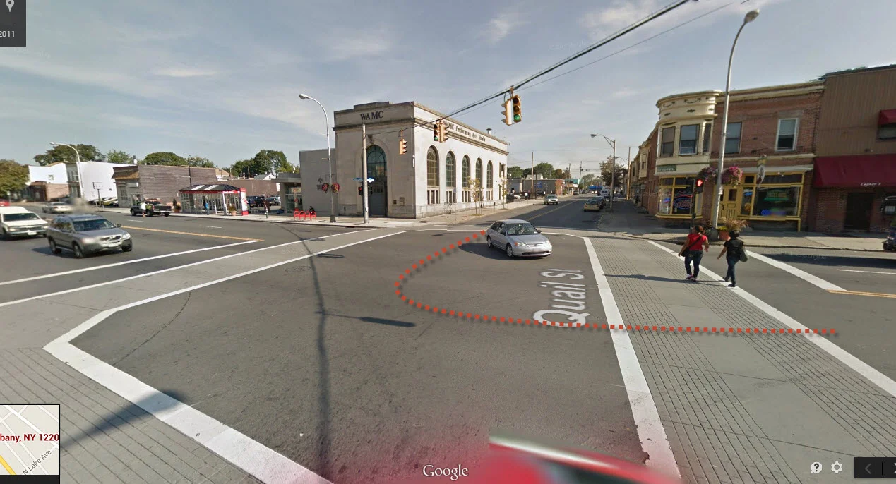 The image below shows the crossing (left) where the accident took place. On the right are two people attempting to cross. Note the huge width they need to traverse where they are completely exposed. I estimate it is 70 feet. These two people look relatively young and healthy, yet they've only made it halfway across when the pedestrian signal is telling them they are running out of time. The car -- which has the same inducements as the garbage truck to enter the intersection at high speeds without anticipating any complications -- is pressing in on the vulnerable people. In some places such activity may be illegal, but it should not be unexpected given the design. The driver here is taking advantage of the wide open intersection to cut the corner (the same way the garbage truck did). The dotted red line shows a safer path, one that could be engineered into the intersection with some type of obstacle in the center of the street to keep drivers in their lane. Alas, most engineers believe this would slow the flow of traffic (as if the signal doesn't already do that) and present a danger to vehicles and so they would oppose this logical safety measure.