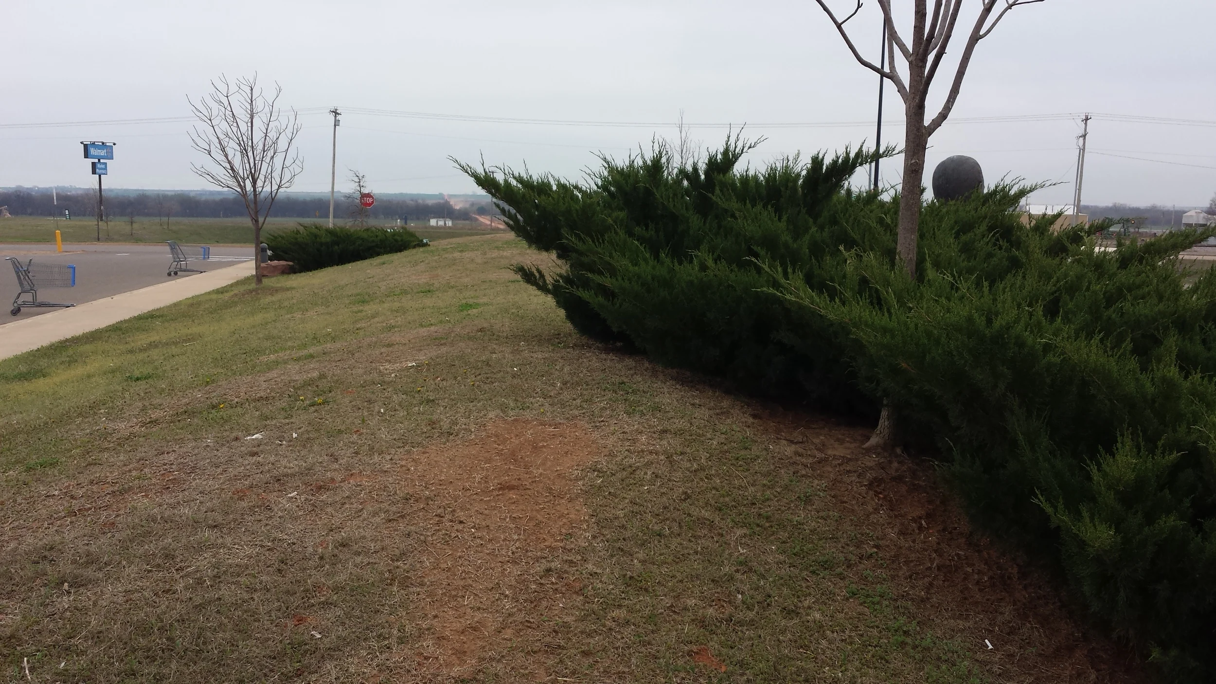 Yet, as you gaze at the torso that emerges from a protruding block of concrete and the levitating dog that guards it, the existing Wal-Mart facade beckons gently in the background. Why the superficial buffer of the berm? Why the illusion of separation created by the miniature trees and shrubs? Come back, Sam. Let the present glory of the tiny American flag flapping next to the grand Wal-Mart logo honor you. Face your creation with pride!