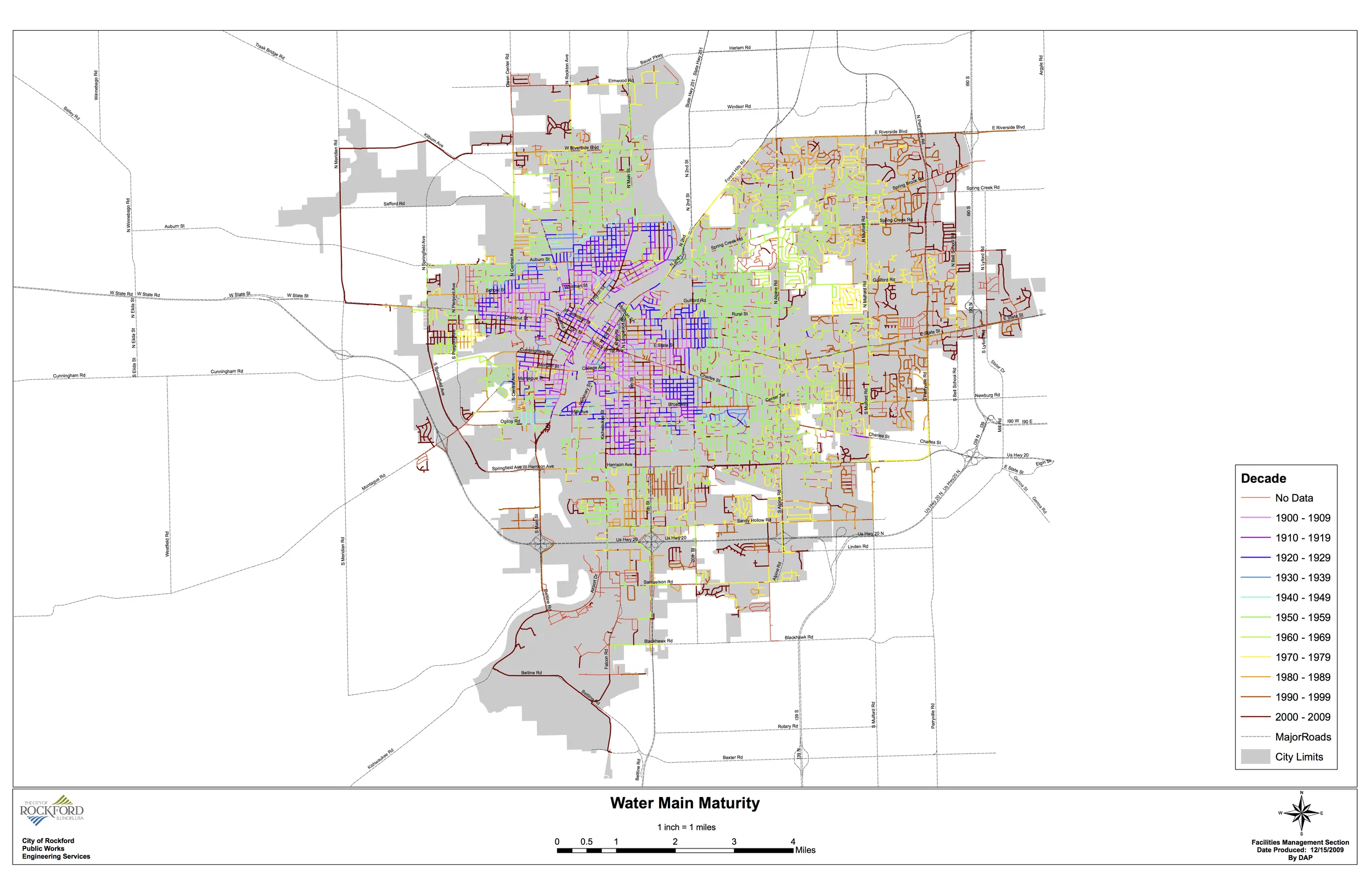The Strong Towns message also resonates because of its universality. Last September’s post about the Pipes and Hydrants in Lafayette rang all the more clear as we began to learn more about the water system in our own city of Rockford, Illinois. Rockford is located about 85 miles west of Chicago, was chartered in 1852, and currently has a population of about 150,000. An industrial giant in its heyday, Rockford faces the challenge of reinventing itself while also meeting the mounting obligations of decades of infrastructure expansion. Last fall as City Council considered water rate increases to provide more revenue for water pipe replacement, we did a little digging of our own to try and better understand the true nature of the deficit.