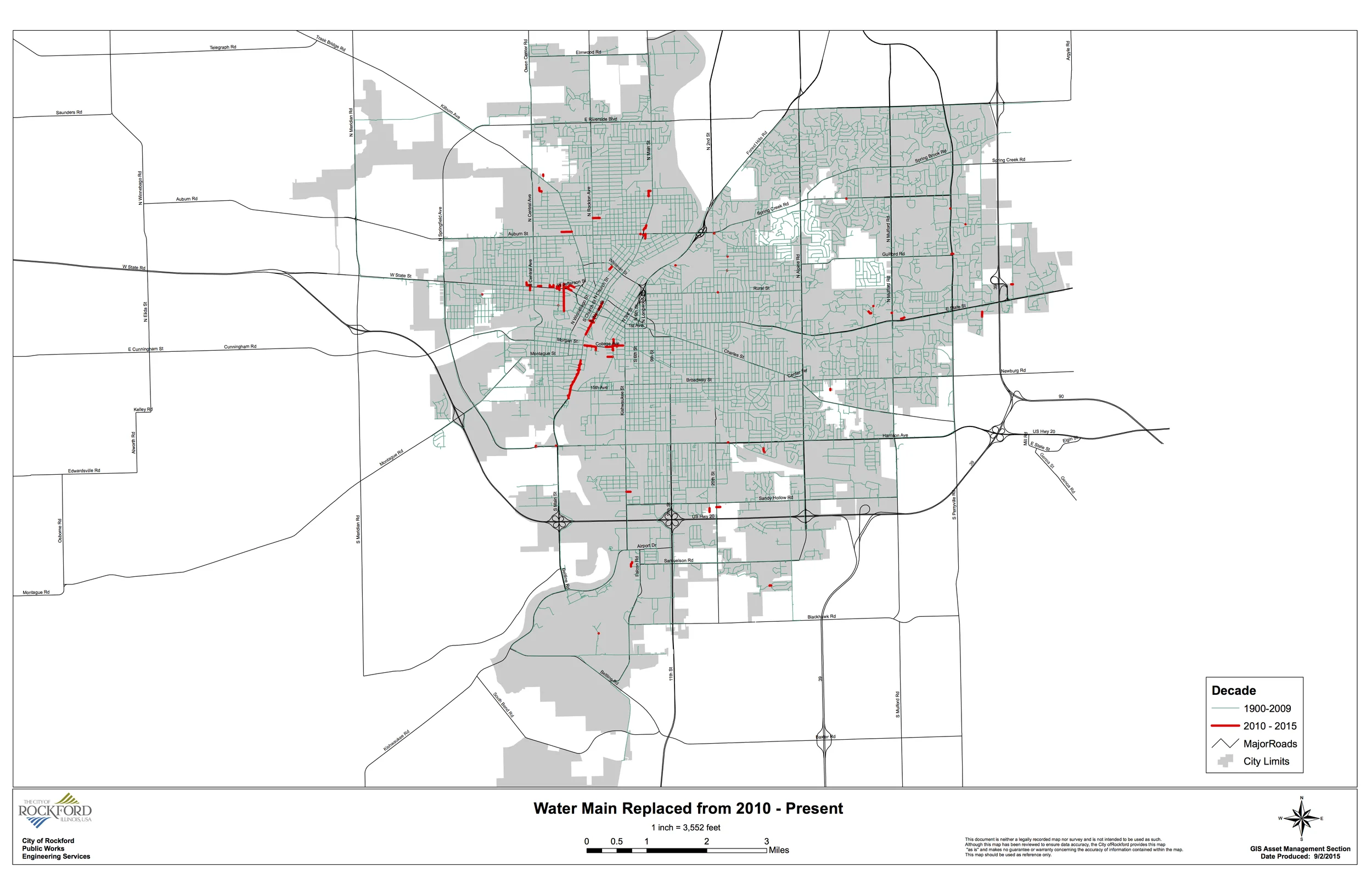 This map depicts the age of water mains within Rockford’s water system, a rainbow radiating out from the banks of the Rock River that show the story of the city’s development. Those pretty pink and purple lines indicate pipes that were installed over a century ago, and in fact, there are 120 miles of pipe that were installed pre-WWII and have exceeded their useful life of 70 years. The City CIP indicates an additional $200M is needed, today, to replace those pipes (for perspective, the full 2015-2019 CIP totals only $139M). Public Works aims to replace 3-4 miles of pipe every year but a combination of unexpected breaks requiring emergency repair and deviation from the scheduled triage of replacement due to road work projects has led to only about one mile of pipe being replaced each year for the past decade. In the second map, red lines indicate pipes that have been replaced since 2010. Nearly every inch can be explained by an IDOT road project on a state highway that runs through the city.