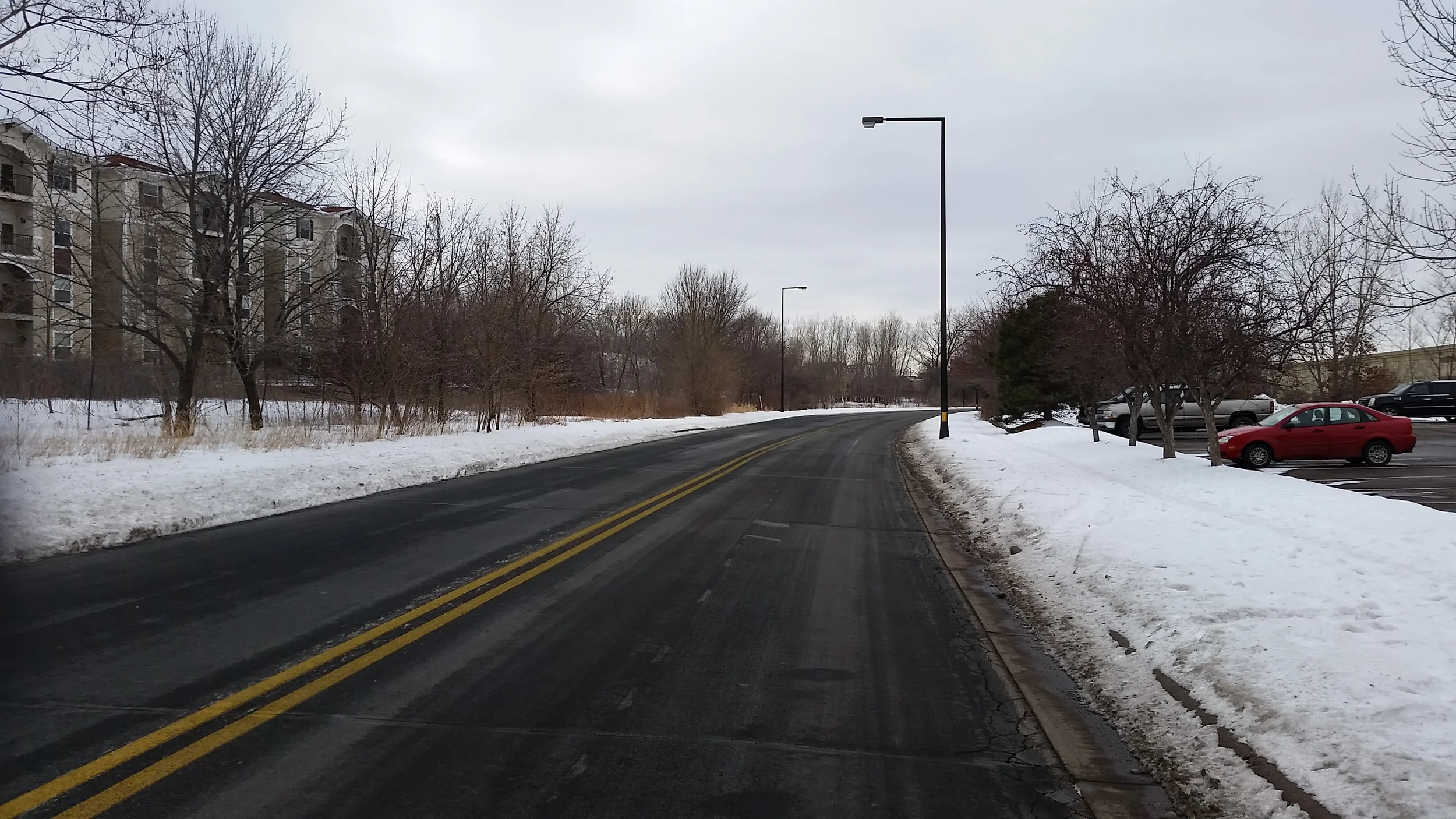 On nice days, I bike to the University. Yes, even in the winter. I don't have snow tires or any special gear or clothing. If there's snow or ice on the roads, forget it. I am not a diehard winter cyclist—and that is the point: you don't have to be to do it once in a while when the conditions are right. Fortunately, much of my ride is on a dedicated, bike-and-transit-only road the U of M maintains to connect its St. Paul and Minneapolis campuses. It looks like this. Motorized traffic consists of a bus every 5 minutes and the occasional cop car.