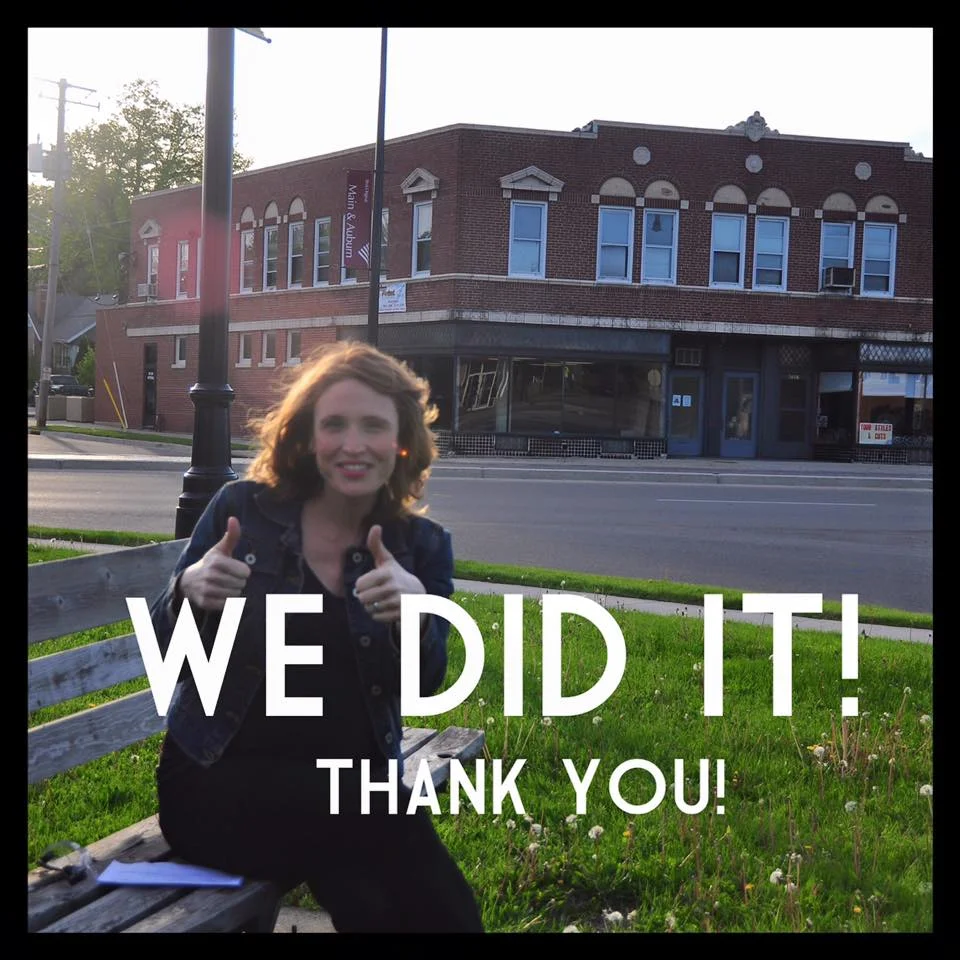 Emily shares the news that her Kickstarter campaign was successful. Behind her is the building. (Image from The Norwegian Facebook page)