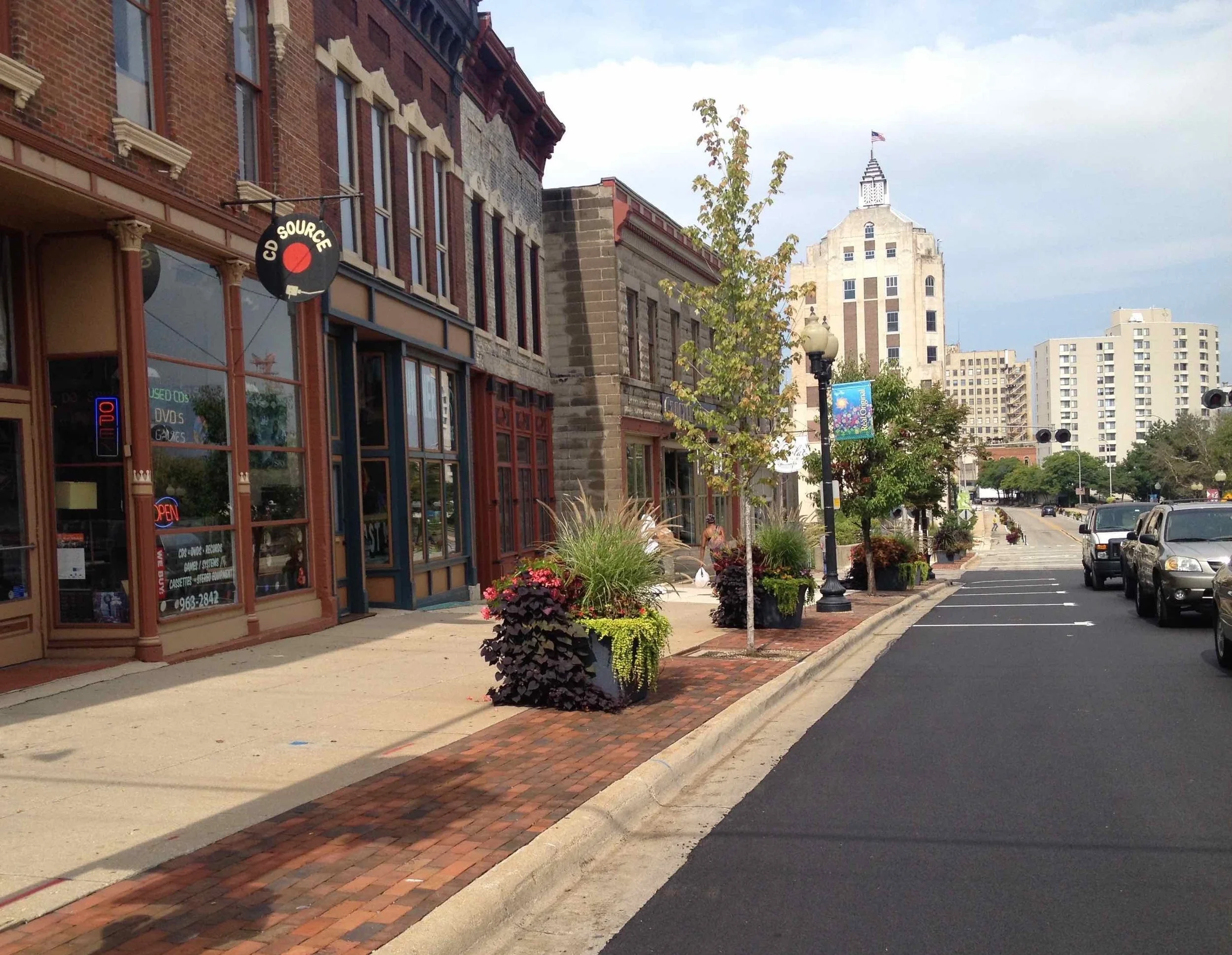 Mixed use buildings and safe sidewalks in downtown Rockford.