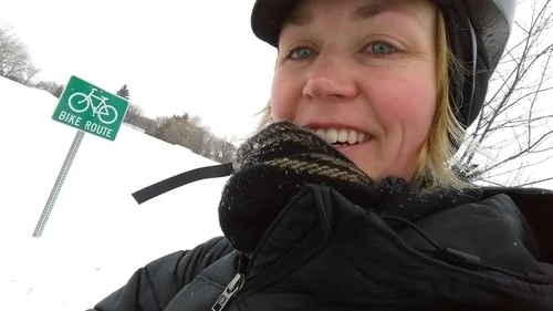 Sara is an avid bicyclist. She takes a utilitarian approach with her winter biking setup using an old beat up mountain bike that she lovingly describes as a POS. She has a studded tire on the front wheel and has the bike outfitted with fenders and lights - which she says are key...