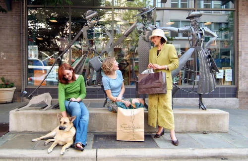 Three women in front of the Shopping Daze sculpture. (Source: Explore Asheville)