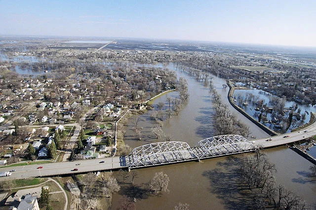 The Sorlie Bridge between Grand Forks, North Dakota, and East Grand Forks, Minnesota, during the 1997 Red River flood. (Source: Wikimedia)