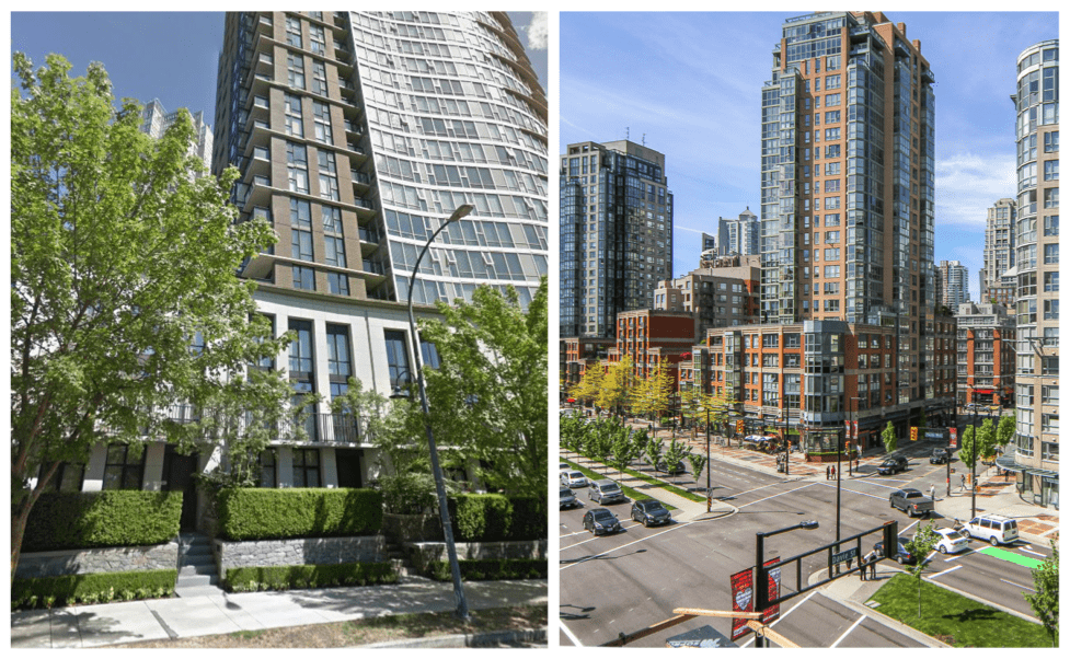 The Vancouver “podium & tower” building type. Left: residential version. Right: mixed-use version (Image source: Residencity).