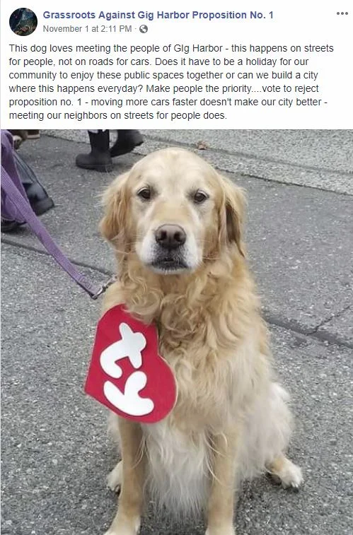 “I live in Gig Harbor, south of Seattle, across the famous bridge from Tacoma, in the booming Puget Sound region. The narrative in our town is that we need more roads because so many people have moved here. The council and mayor established a Transportation Benefit District (TBD) , as allowed by state law, and put a measure on the ballot for a 0.2% sales tax increase to fund transportation projects. The resolution that formed the TBD stipulated that money raised could be used for projects "for motorized vehicles only." I volunteered to write the “Against” statement for the voters' pamphlet and lead the campaign against the proposition. After debating our major at a public forum put on by the Chamber of Commerce, I submitted this to our local paper (and it was published):