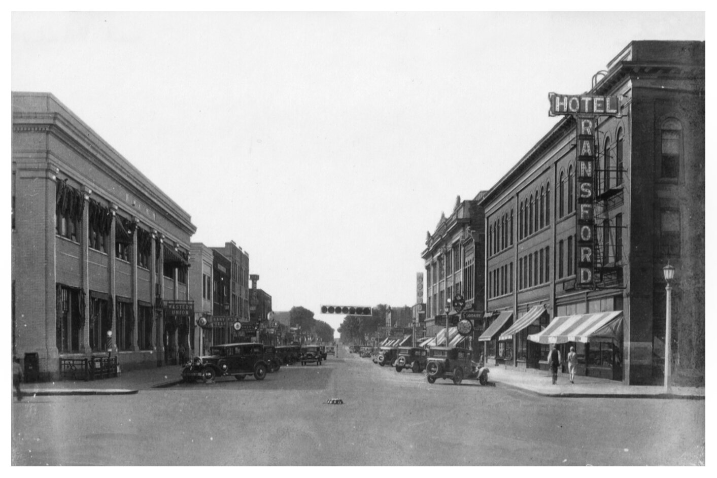 Simple, utilitarian structures comprise the first foothold in a place people have discovered a reason to be. But they give way as the occupants build up a bit of wealth to higher quality and more permanent buildings. Public infrastructure improves in tandem with private development. In this photo of Brainerd, Minnesota from the 1930s, you can see that not only have the simple wooden buildings pictured above been replaced by multi-story edifices of brick and stone, the street has acquired curbs and a sewer (note the manhole cover):