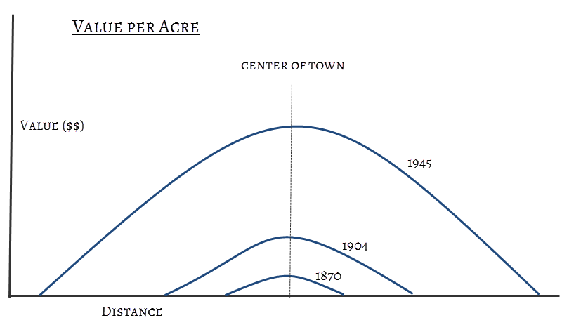 The below graphic illustrates the pattern of land productivity that emerges across the city as a whole, where land values peak in the core and decrease toward the periphery, while rising everywhere over time. (The three years labeled, which made sense in the graphic’s original context, are arbitrary for our purposes here—you could substitute any comparable passage of time and the point remains the same.)