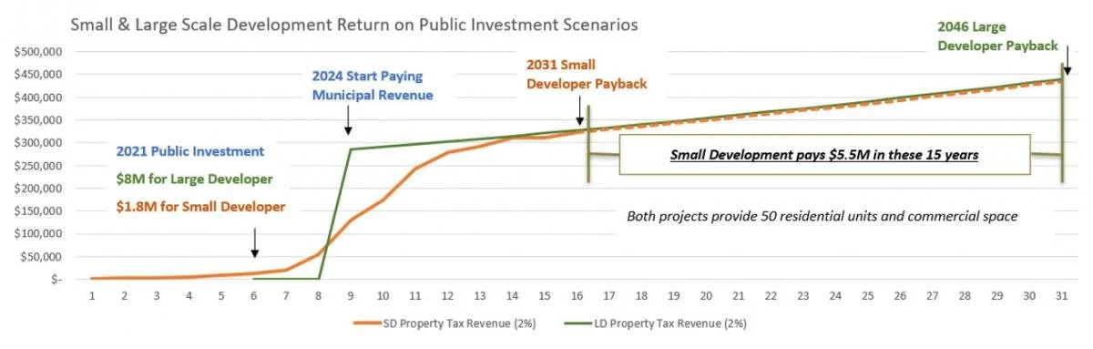 The case study of Mike Keen’s Portage Midtown ”farm” in South Bend (discussed in the previous installment of this series) is merely one illustration. A financial analysis by Neil Heller of Neighborhood Workshop estimated that by 2031, redevelopment of these 95 small lots over only three acres would produce $15.2 million in private investment, while generating 50 new homes and 172 jobs. But Heller also contrasted this performance to a hypothetical scenario in which a single large building were built containing the same amount of housing and commercial space. Under that scenario, $8 million in up-front tax incentives would be necessary to render the project viable in South Bend’s market. As a result, the large development wouldn’t pay off its public investment until 2046: fifteen years later than the incremental approach. (In fact, Heller writes, Keen and his partners were able to acquire the Ward Bakery building “after acquiring mid-size developers joined the ranks of six previous failed attempts at a New Markets Tax Credit application. Mike’s ‘farmers’ have created enough value that tax credits are not needed.”)