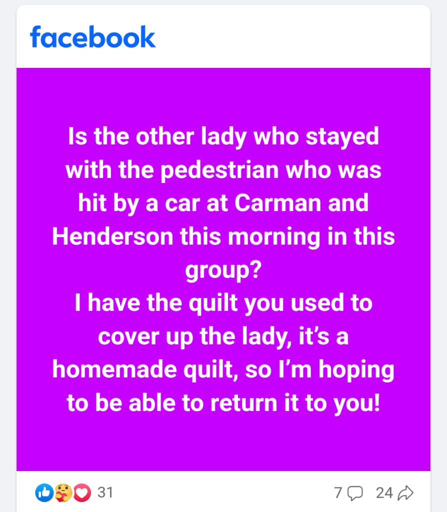 Last Thursday morning, a person walking in my neighborhood was going about her daily business when she was struck by a someone driving a car, at the corner of Henderson and Carmen Avenue.