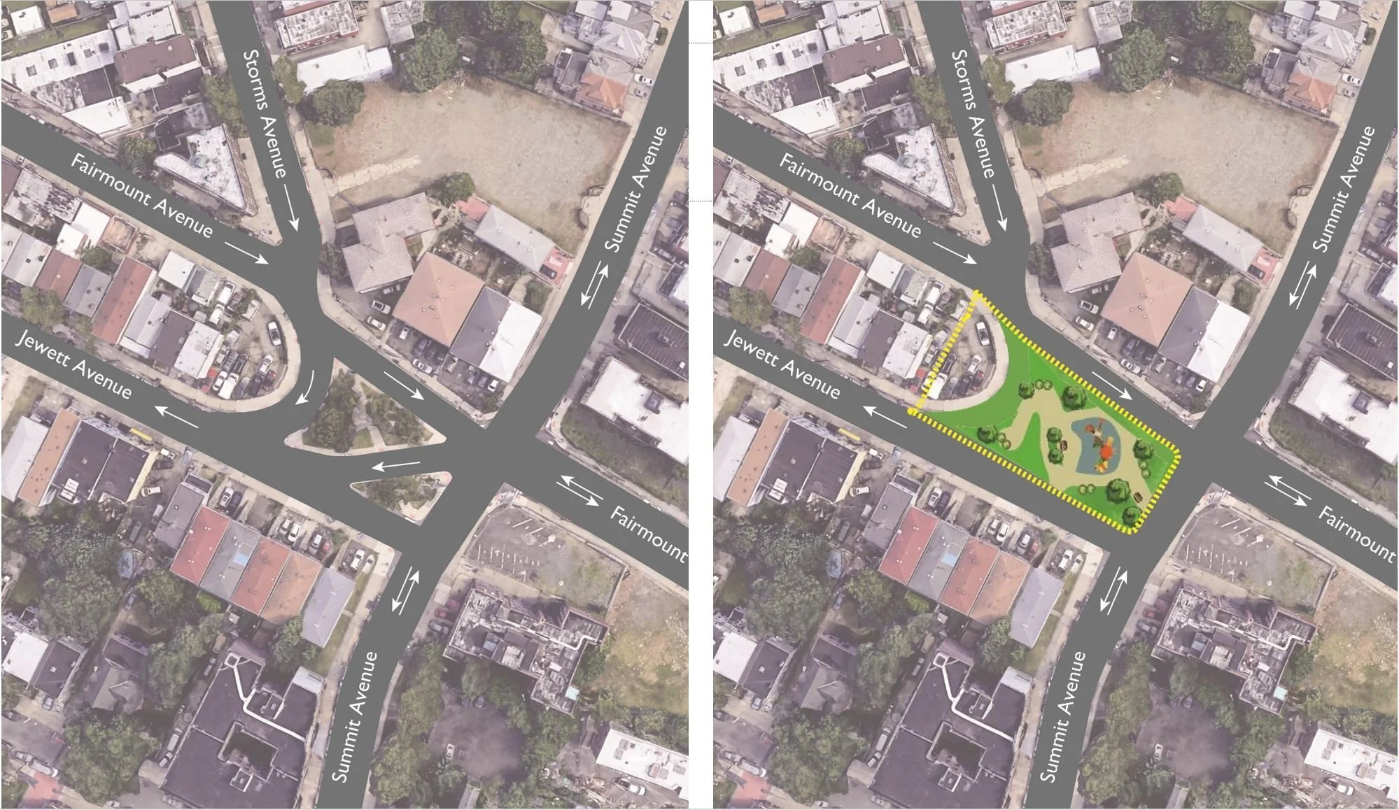 Fairmount Triangle before (left) and after (right). (Source: Street Plans.)