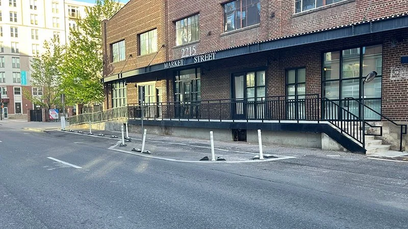 Here is an example of street redevelopment in Denver, where paint and bollards are being used to carve out a sidewalk. The original pavement touched the front of these warehouse buildings, connecting the street to the loading docks. Today, these buildings have a different use, so the street connection is no longer required.