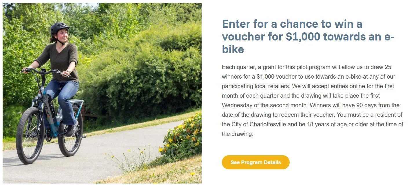 Charlottesville’s walking tours are just one piece of a broader effort to make the city less car-dependent. Another standout initiative? An e-bike voucher program that provides selected residents with up to $1,000 toward the purchase of a locally sourced electric bicycle.