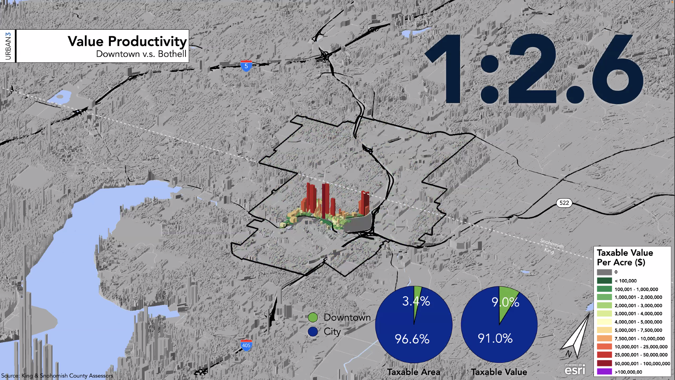 This detailed comparison reflects a broader challenge for Bothell. Urban3’s data shows that Bothell’s downtown area is 2.6 times more productive economically than the rest of the city. While this indicates downtown is a key economic driver, it falls short of the roughly 6:1 productivity ratio that Urban3 suggests is optimal.