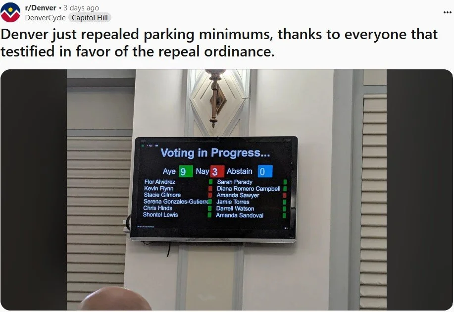 Locals celebrating Denver’s parking reform on Reddit. Strong Towns advocates were part of the push to bring this over the finish line.
